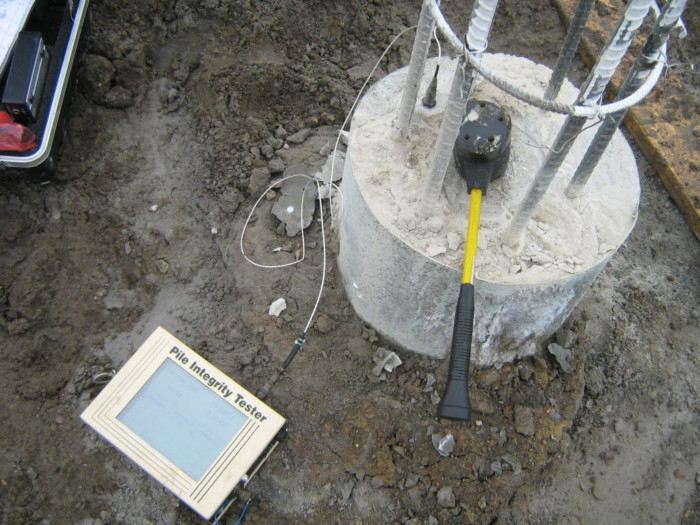 通过将加速度计连接到深基础顶部并使用特殊帽的轻质(1至8磅)锤子撞击顶部来进行低应变完整性测试。锤子上的盖子延长了冲击脉冲,使其适用于完整性测试。然后,加速度计测量对诱导应力波的桩响应。
