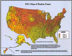 当地土壤和/或基岩中铀/镭的含量会影响氡的含量,而氡的含量可能会影响建筑物中氡的含量。1993年美国环境保护局氡区地图(见下文)根据地下地质情况(即土壤和基岩),描绘了该国氡浓度可能升高的地区。此外,土壤和基岩的类型会影响氡气体通过地表向上迁移并可能进入建筑物的能力。