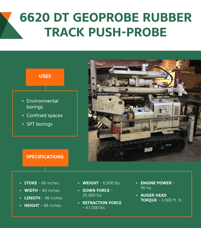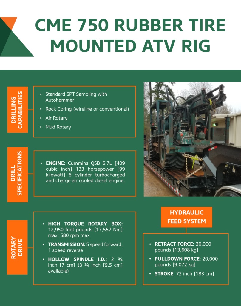 To accommodate our increasing workload in Texas and demand for all-terrain drill rigs, Braun Intertec has added two all-terrain drill rigs toour fleet. The new rigs are a CME 750 Rubber Tire Mounted ATV rig and a 6620DT Geoprobe rubber track push-probe rig equipped with a GH62 Autohammer. Both rigs were specifically selected to allow us to access challenging sites to better serve our clients on the toughest projects.