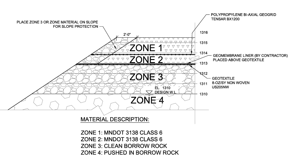从表面负荷预期的负荷范围为2600psf至7500psf,最大的装载来自开发的桥梁施工。为了适应这种重要的表面重量,项目团队提出了一种由四个区域组成的堤道设计。由于Rouchlau坑中存在的深度不同,所需的设计需要解释由岩石较低的岩石中的强度变化,从上面的岩石的重量压碎。为了减少堤道表面的岩石所需的厚度,该团队实现了一款Tensar BX1200,聚丙烯双轴土工格栅,提供了安全稳定的表面来进行施工活动。