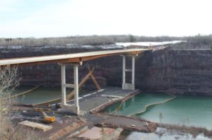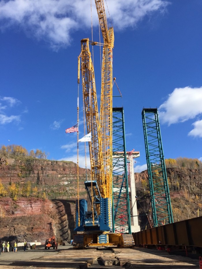 桥梁的显着高度要求为建筑和堤道产生了挑战,以便在桥梁基地提供施工活动的访问。manbet体育滚球被保留设计一个临时岩石堤道,支持施工设备和支架塔的各种表面装载,以及特雷克斯CC 6800重型升降机起重机,其中将桥梁梁在空气中抬起约200英尺以构建十字架的TH 53桥荣誉坑。