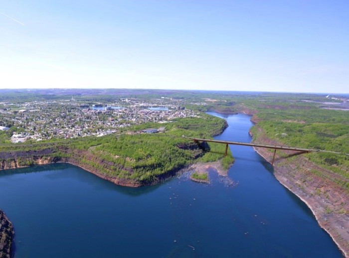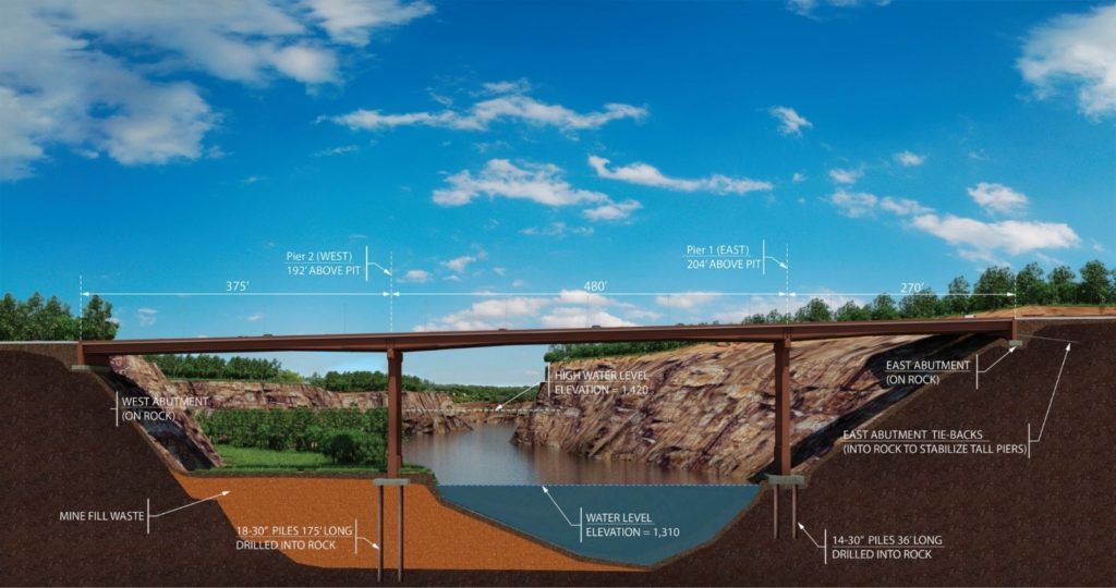 53(53)的行李箱高速公路(Th 53)位于明尼苏达州弗吉尼亚州以南,于1960年建于1960年,由铁矿利率拥有。2010年,这些采矿利益通知MNDOT,即弗吉尼亚州的一部分巷道需要重新安置,以提供有价值的自然资源。新的一致性需要建造一个1,100英尺的桥梁,这是一个被遗弃的露天矿井。自2017年9月自2017年9月以来,这座桥是明尼苏达州最高的。